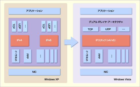 | Windows Vistaでは、1つのコンポーネントでIPv4とIPv6の両方のプロトコルをサポートできるよう新規に設計・実装されている。 |