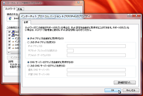 | Windows Vistaでは、OSネイティブでIPv6に対応している。これはIPv6のプロパティ設定画面の例。 |
